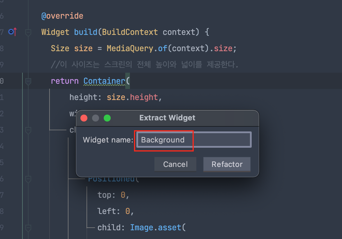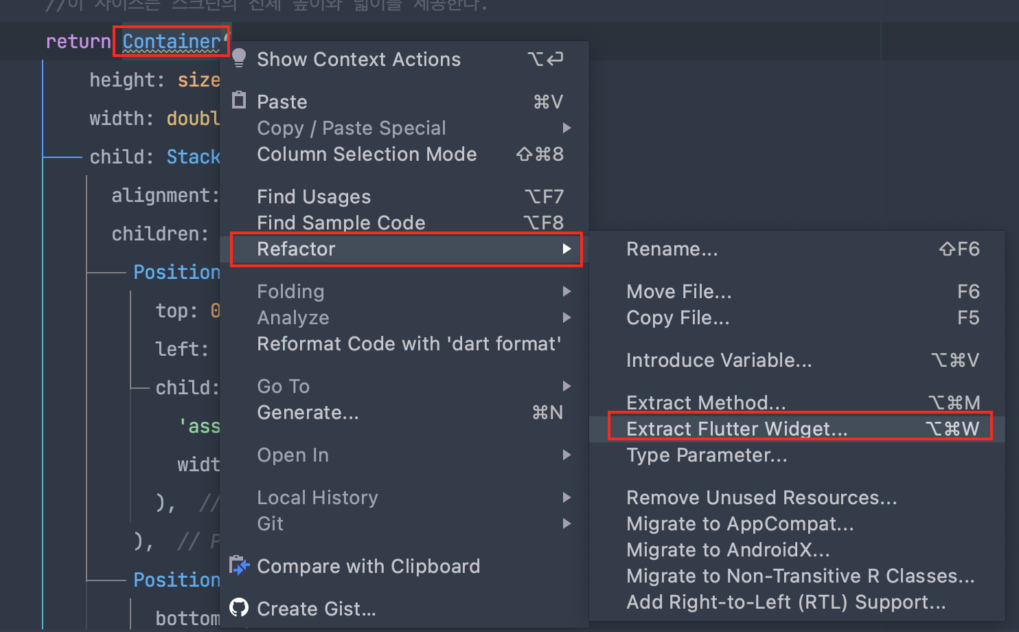 Container쪽에 오른쪽 마우스 클릭 후에 Refactor => Extract Flutter Widgetd을 누른다.