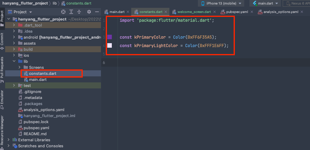 constants.dart 파일을 생성해주고 다음과 같이 주요한 색상들은 저장해 놓는다.
