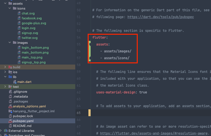 그리고 flutter: 바로 밑에다가 다음과 같이 추가해주었다. (이렇게 바로 밑에다가 안하면 오류 나더라 ^^ )