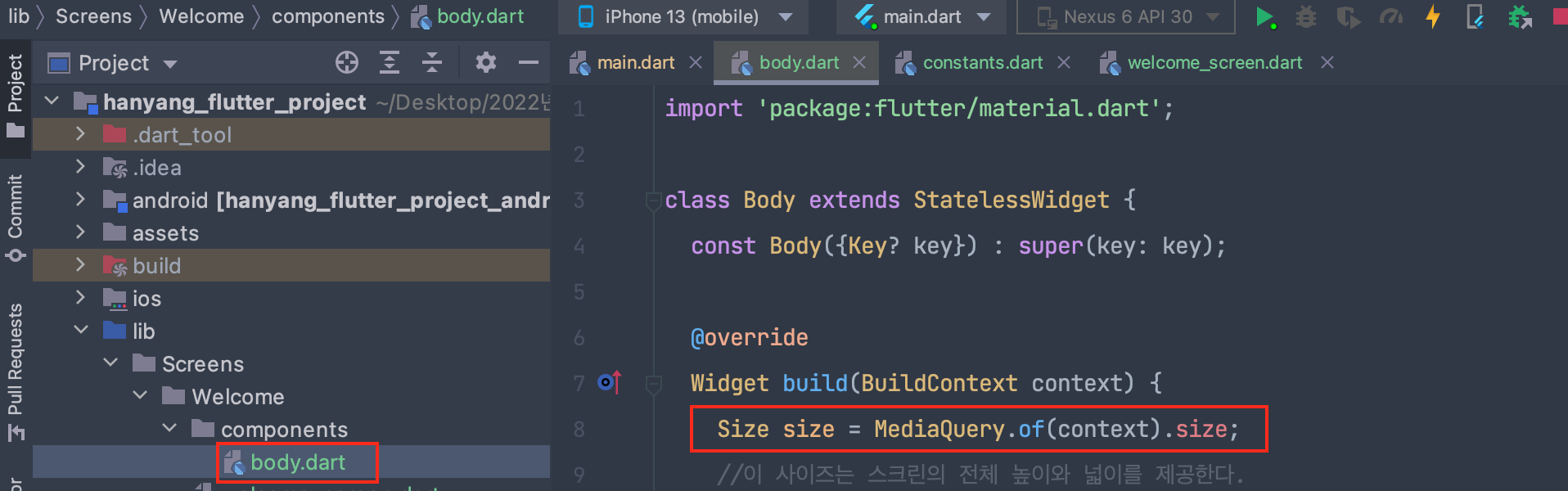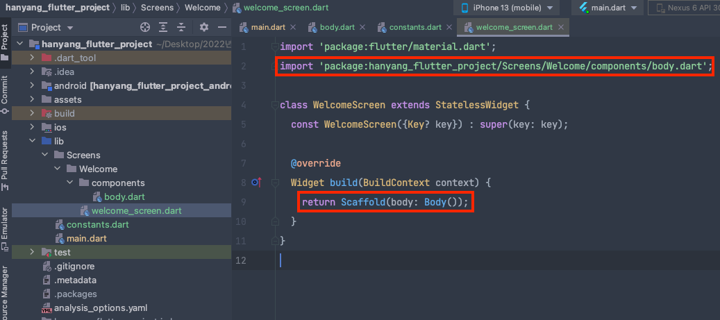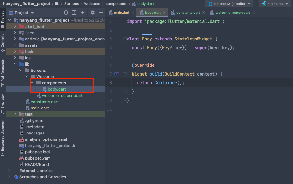 다음과같이 components 폴더에 body.dart를 생성하고 StatelessWidget으로 형성한다.