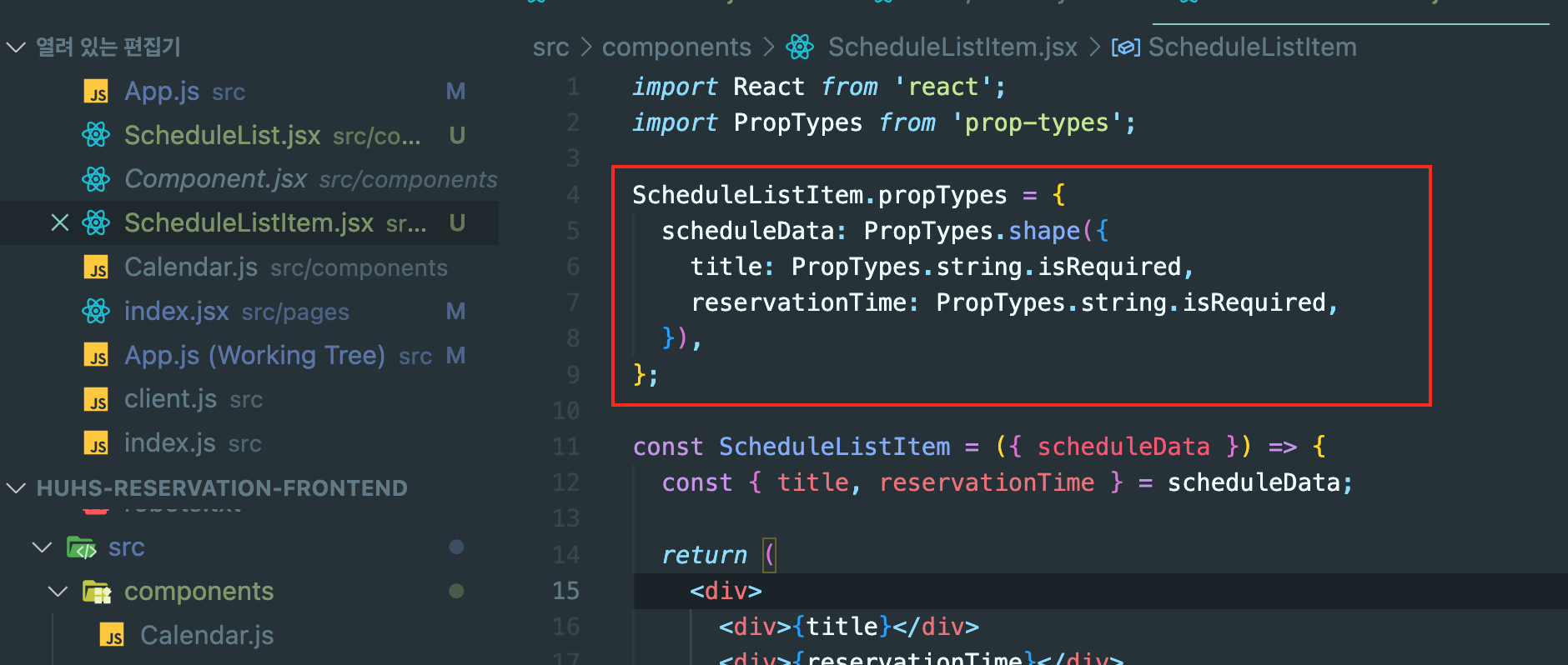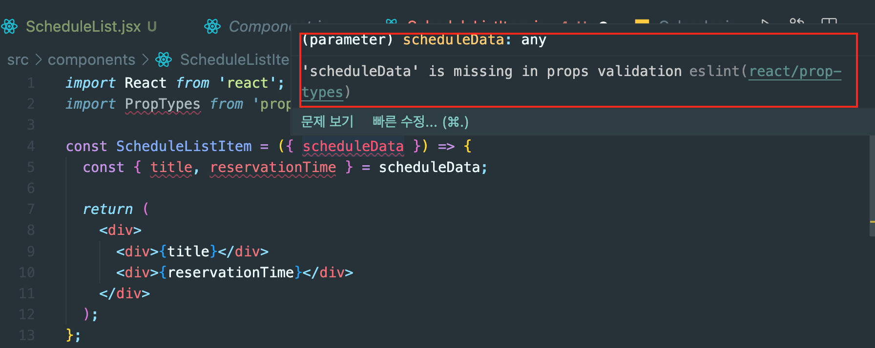 생각해보면 ScheduleListItem이라는 컴포넌트가 정의되어 있지도 않은데 먼저 해당 컴포넌트에 대한 propTypes를 상단에 써버리면