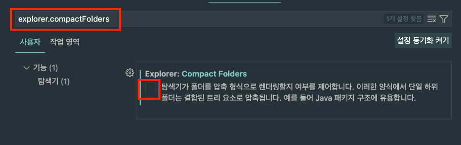 2-2. 검색창에 explorer.compactFolders를 입력한 이후, 만약에 체크표시가 되어있다면 해제 시켜준다!