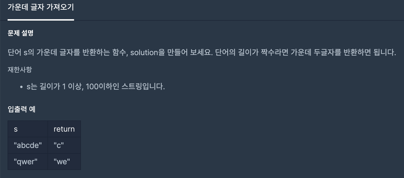 고민하다보니, 길이를 2로 나누었을 때, 몫이 가운데이고, 길이가 짝수인 경우에는 몫과 그 앞의 문자와 함께 가운데이다.