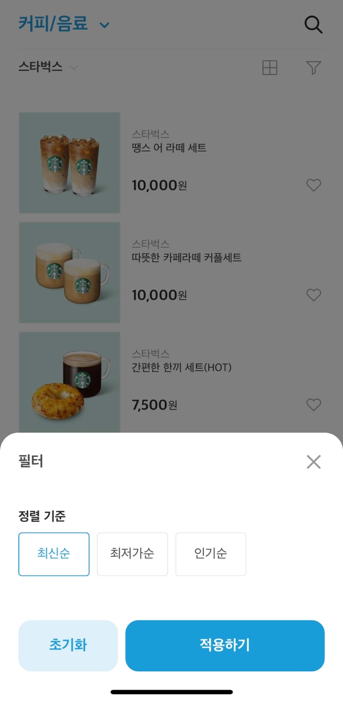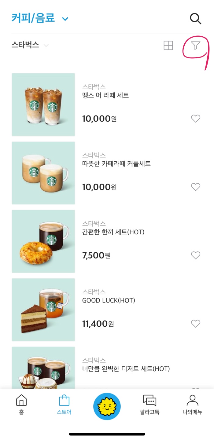조금 아쉬웠던 점은 스타벅스 카테고리 안에 들어갔을 때 정렬기능이나 필터 기능이 없었다는 점이다.