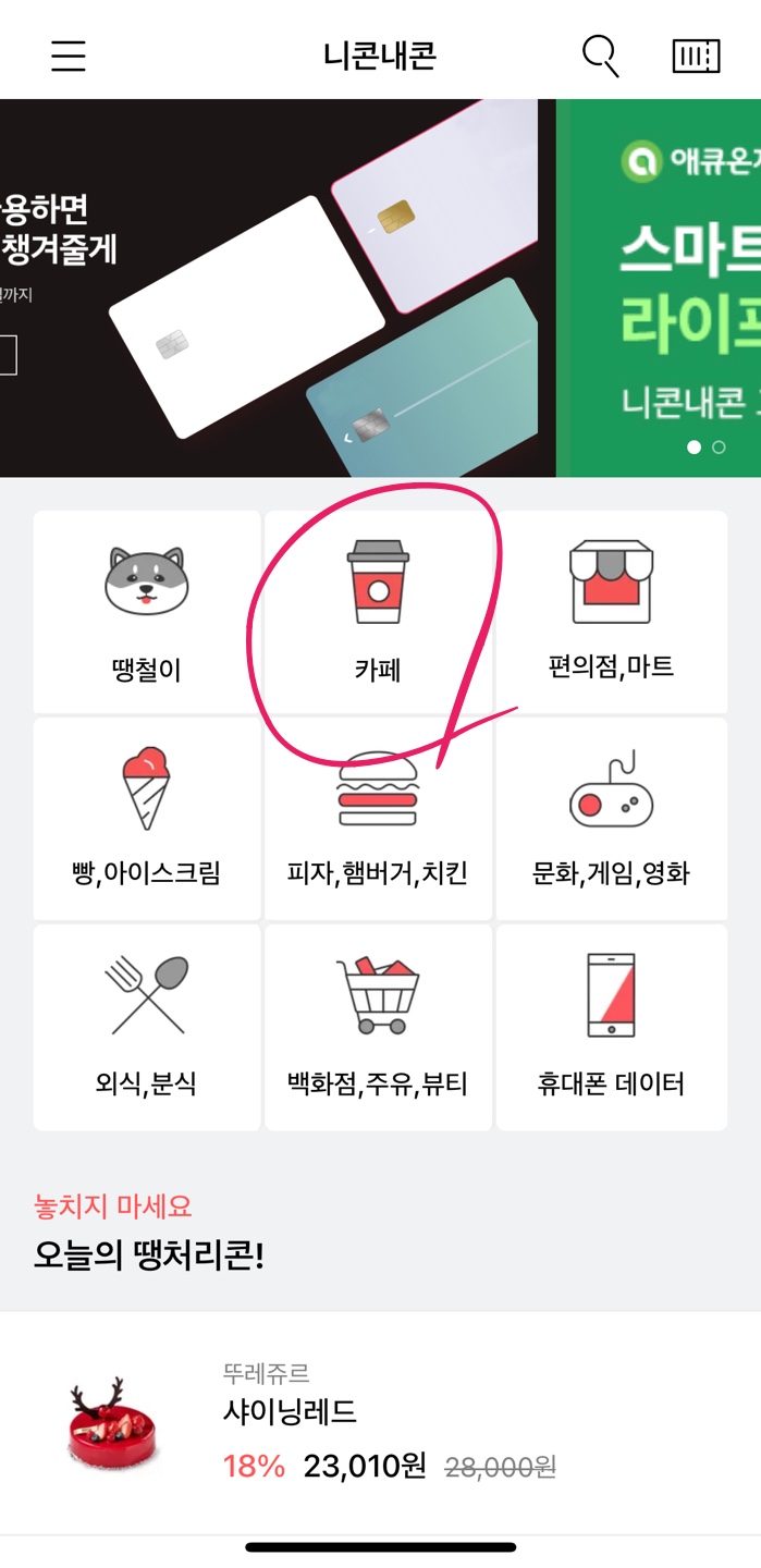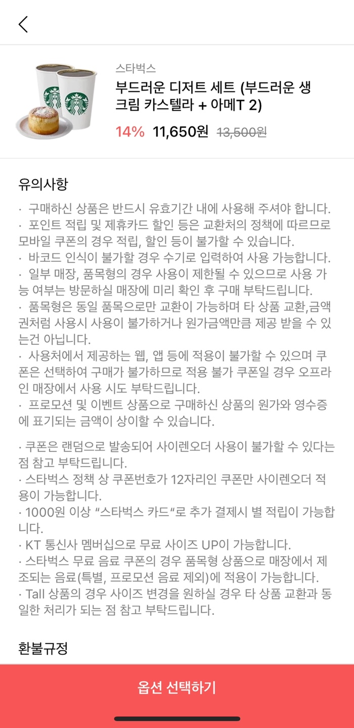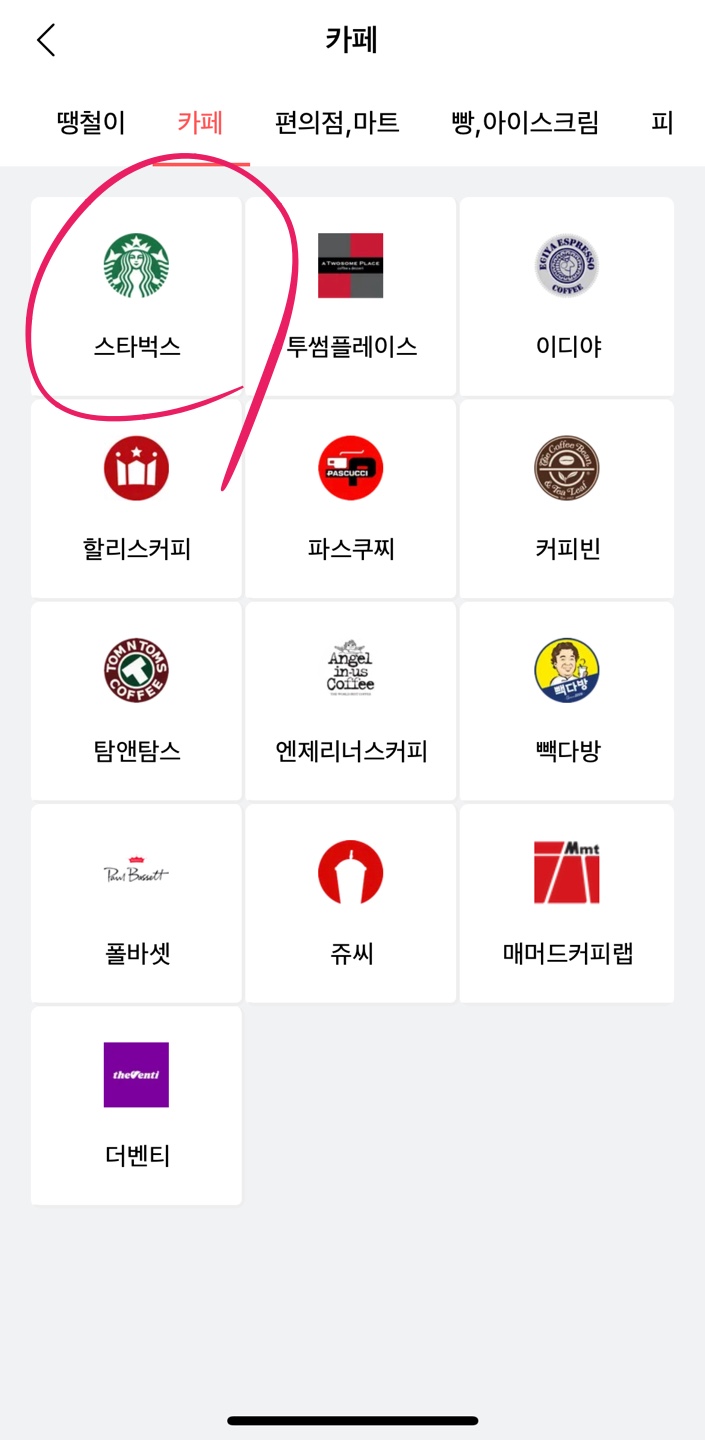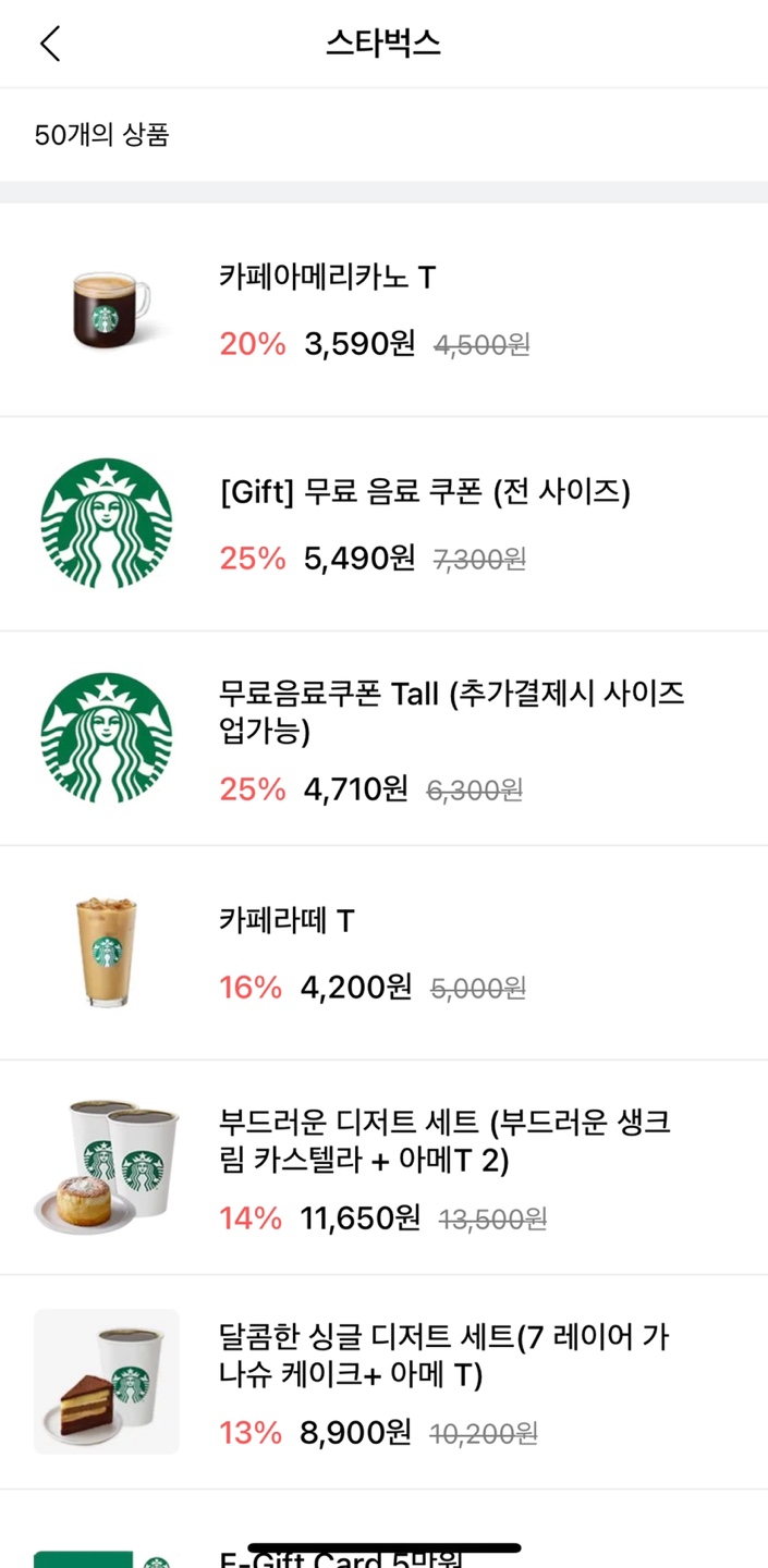 (상품은 스타벅스 카페를 선택해서 들어가보았다. 이유는 카테고리안에서 상품이 제일 많이 등록되어있을 것이라고 예상해서이다.)