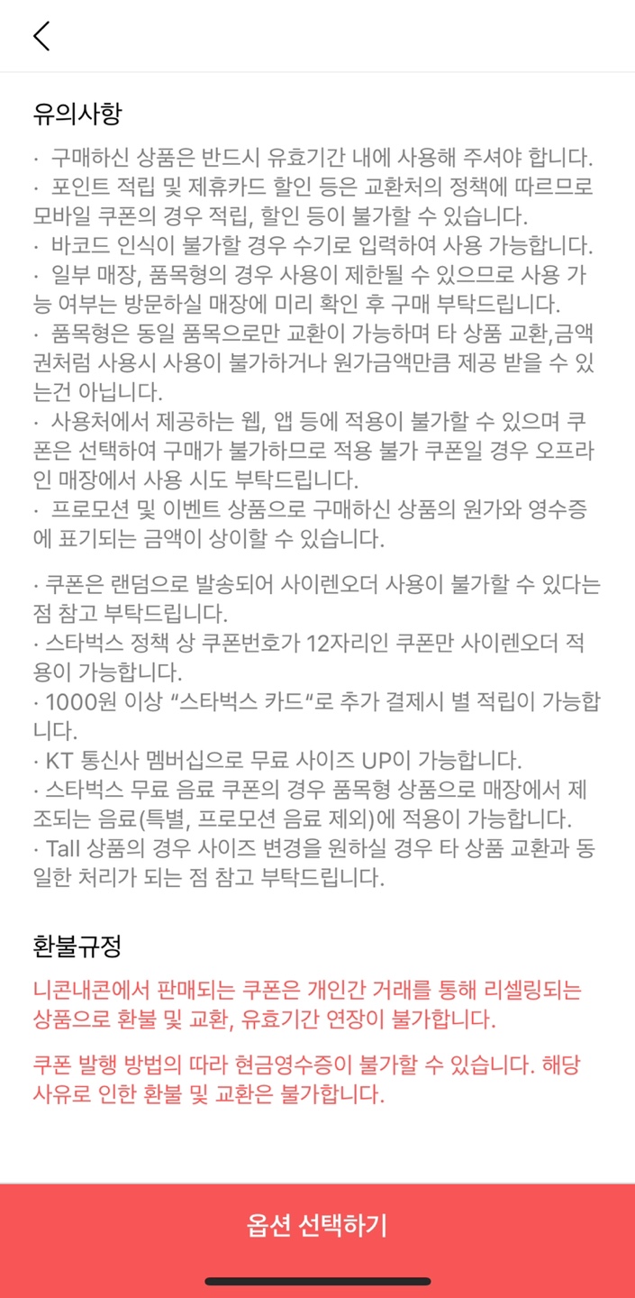 화면 제일 상단에는 해당 상품의 이미지와 가격이 써있고, UI의 90프로 이상이 유의사항과 환불 규정으로 도배되어있다. 😵💫