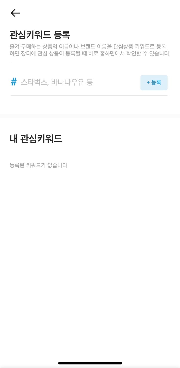 이는 관심 상품을 키워드로 등록하면, 관심 상품이 등록 될때, 홈 화면에 표시 해주는 기능이다.