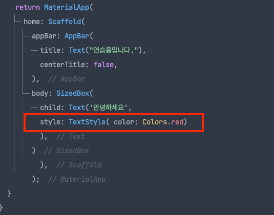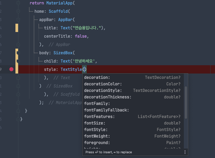 텍스트 스타일 같은 경우는 TextStyle() 안에 자동완성 해보면 많이 나온다.