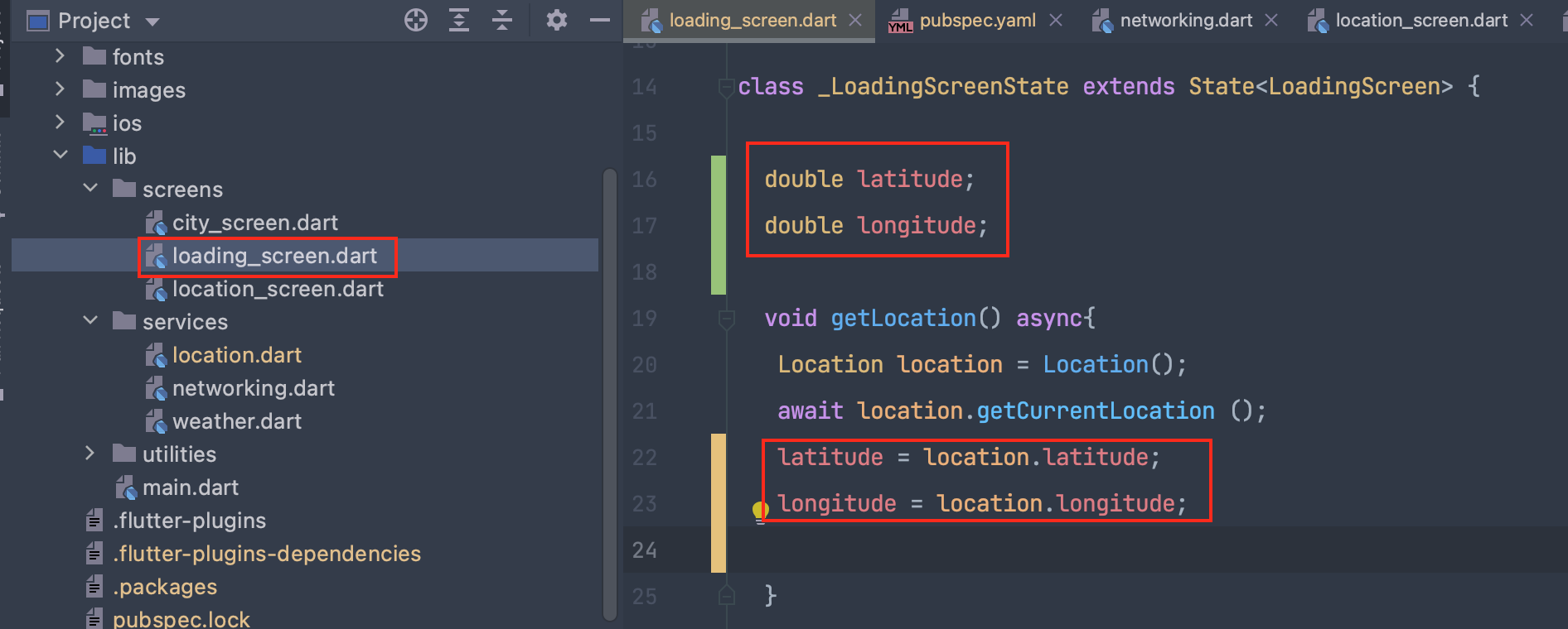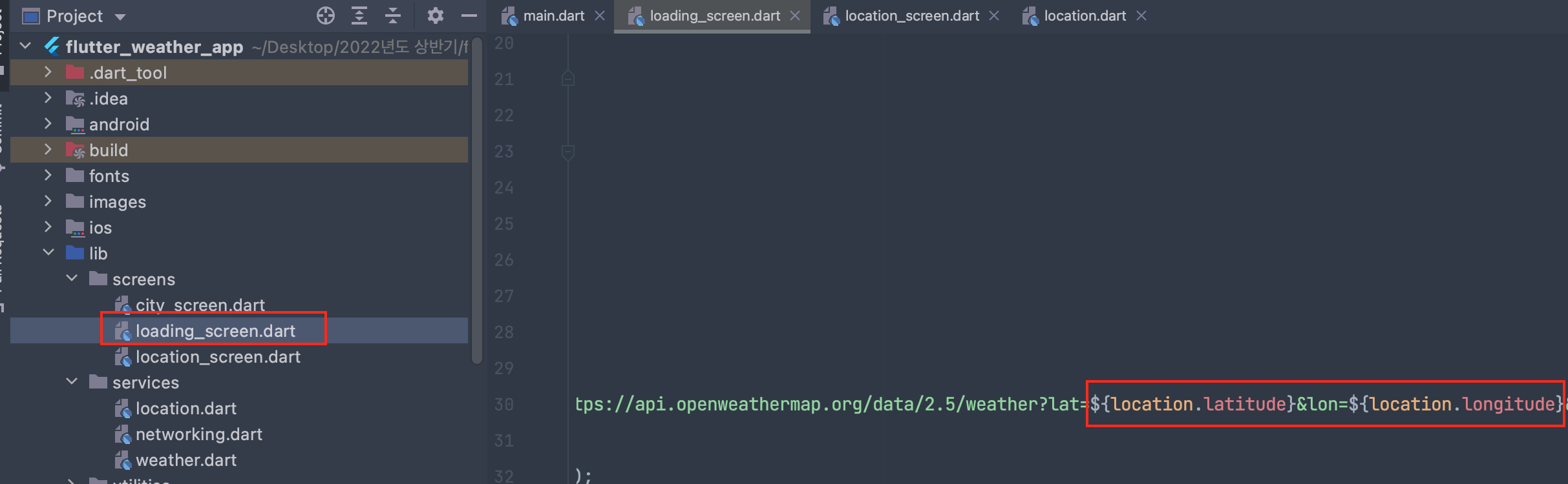 latitude, longitude 변수를 선언해주고, location에서 가져온 정보를 넣어준다.