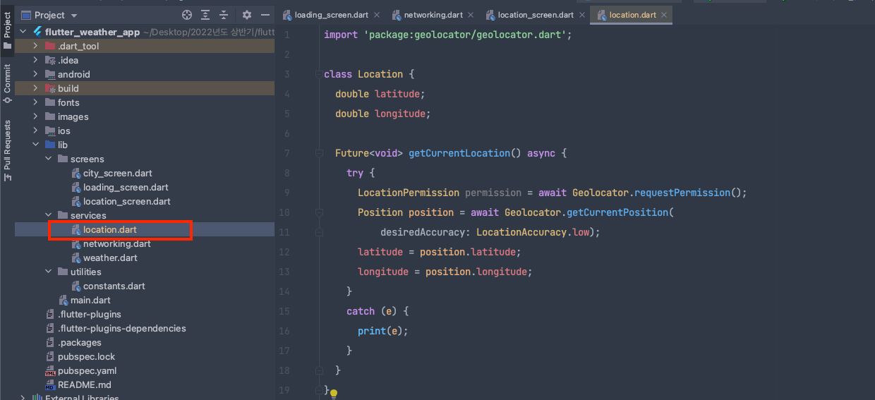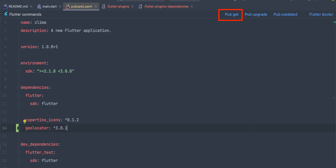 pubspec.yaml 파일로 가서 geolocator: ^3.0.1을 입력해준다.