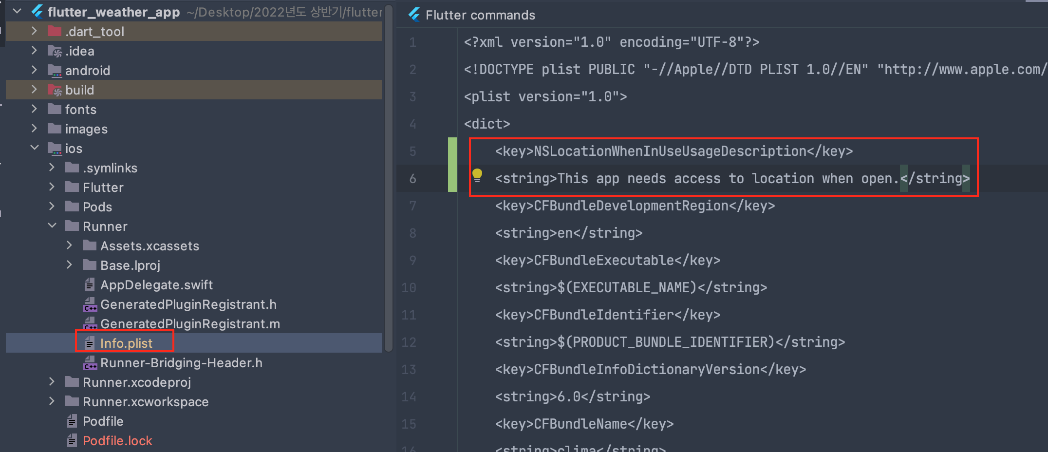 ios 폴더에서 info.plist파일 안에 <dict> 태그 안에 다음과 같이 추가 한다.
